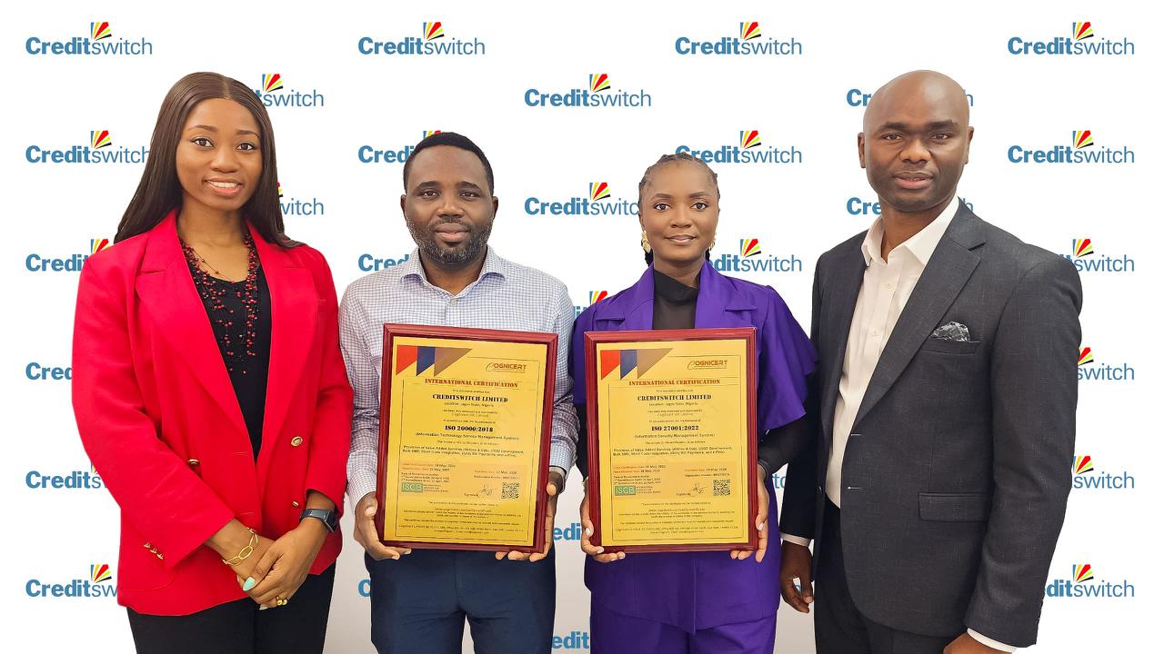 L-R: Olufunke Williams (Head, People and Culture), Adedapo Adebayo (Head, Internal Audit), Enitan Kuton (Head, Marketing and Communications), and Michael Elue (Chief Information Officer) of Creditswitch Limited, during the official presentation of the ISO/IEC 27001:2022 and ISO/IEC 20000:2018 certificates at Creditswitch’s head office in Lagos, Nigeria.